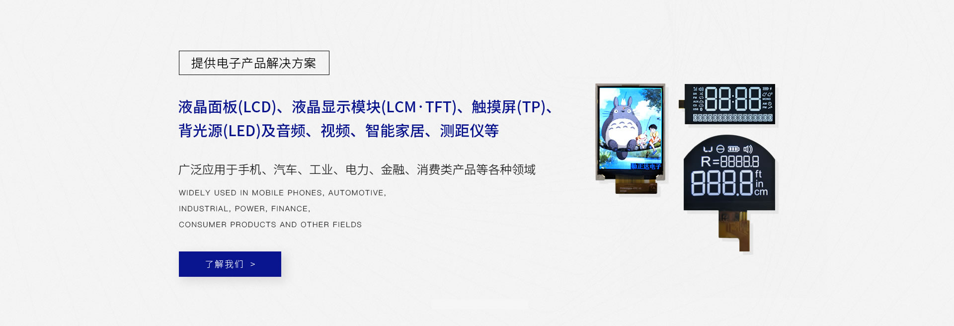 專業(yè)設(shè)計(jì)、生產(chǎn)液晶面板(LCD)、液晶顯示模塊(LCM·TFT)、觸摸屏(TP)、背光源(LED)及音頻、視頻、智能家居、測(cè)距儀等